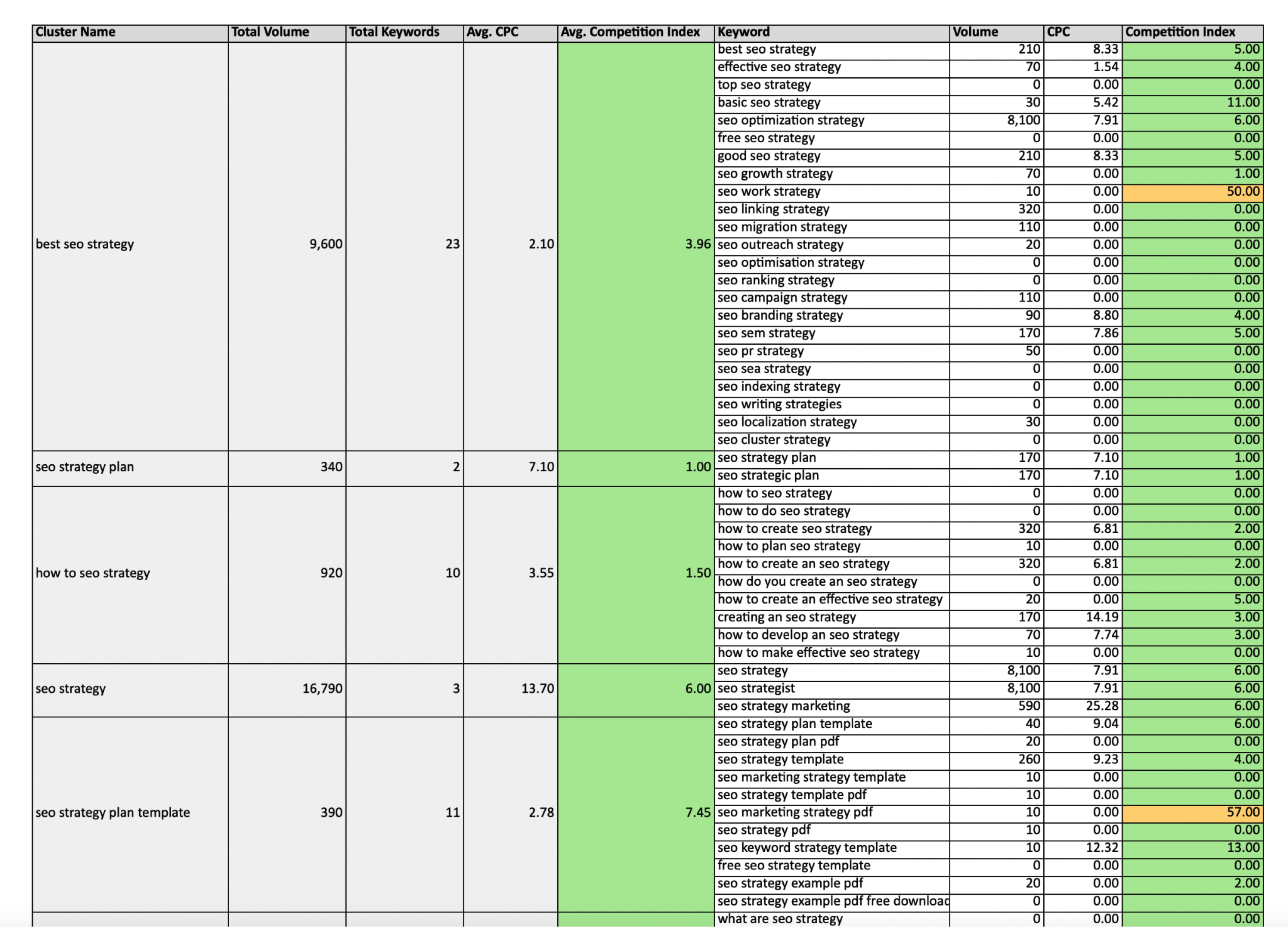 It’s fast, too. Then you can simply export your clustered keywords in a topical map as a CSV for all your SEO content planning needs. The exports come with all search volume, CPC, and competition data, too, so you can plan effectively which clusters to target first.