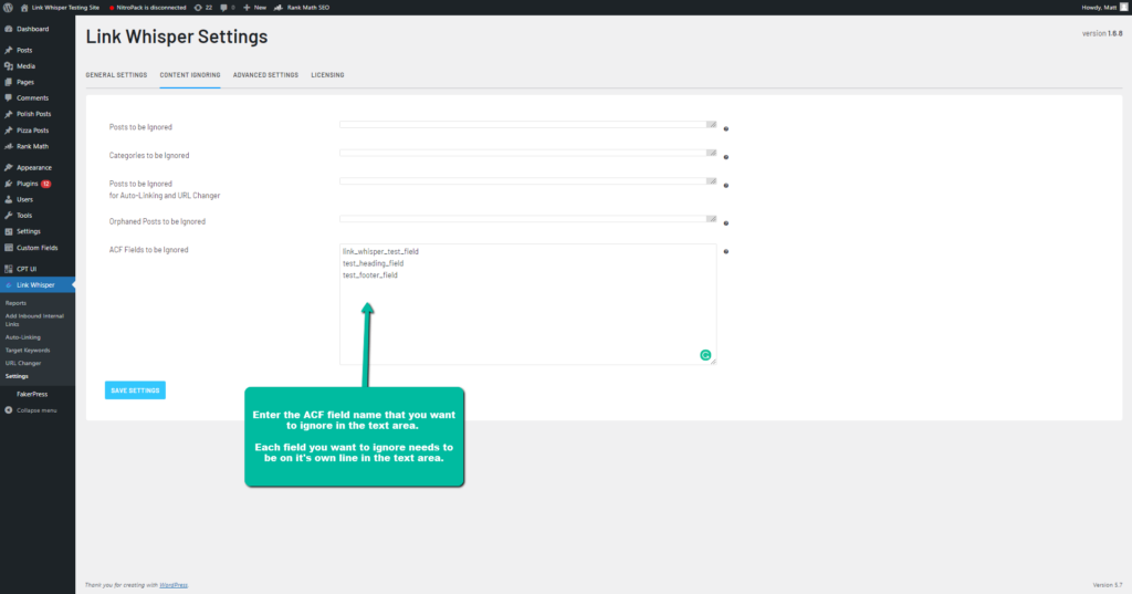 Yes, you can. Specific ACF fields can be ignored from the Link Whisper settings. To ignore an ACF field, go to the Link Whisper settings and open the “Content Ignoring” tab.