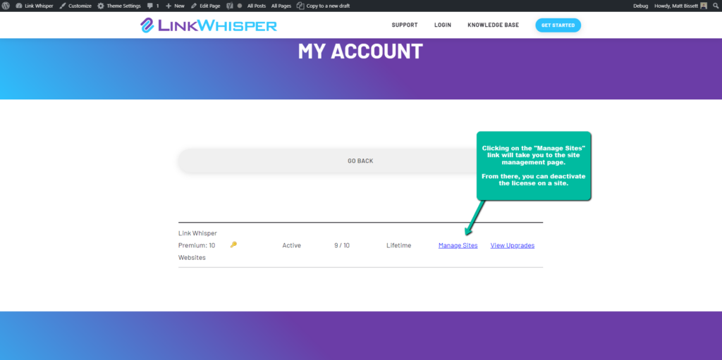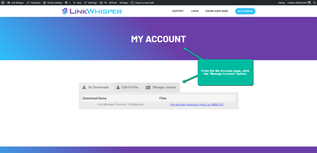 The first step is to deactivate the license on the site you want to transfer the license from. To do this, go to your account on linkwhisper.com and click on the “Manage License” tab.