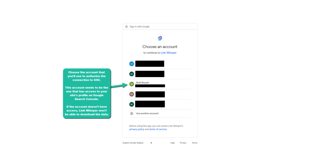Once you’ve picked the account you want to use, you’ll be asked to choose what permissions to grant Link Whisper. The permissions needed are selected by default, so all you have to do is click “Continue” to proceed.
