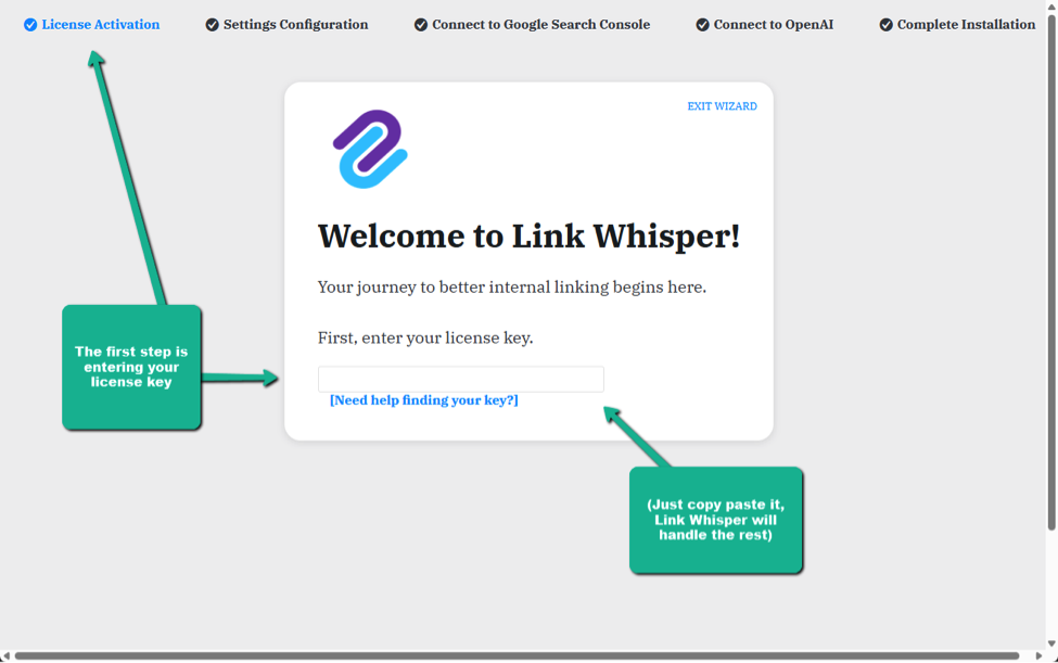 The first step will be to enter your license key. Just copy and paste it from your activation email, and Link Whisper will handle the rest!