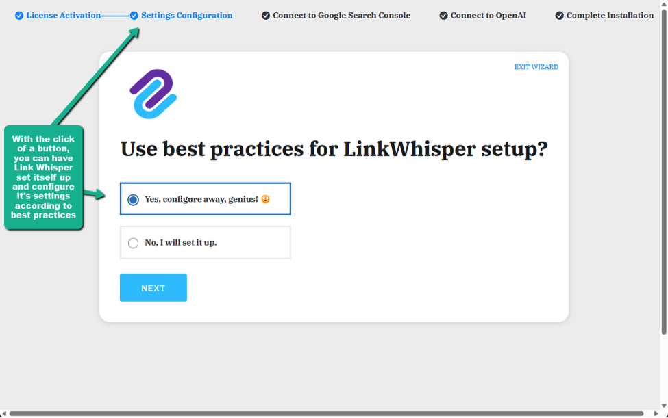 Next up is a really simple question: Do you want Link Whisper to configure its settings based on the best-use practices? Saying “Yes!” tells Link Whisper to set itself up with what we’ve learned over the years of setting up Link Whisper.