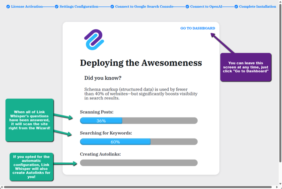 The Launch Wizard streamlines the whole process of setting up Link Whisper and makes it super easy to hit the ground running.