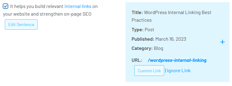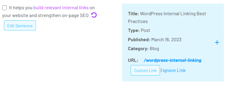 It also provides link suggestions in posts and makes it easier to insert internal links into the page.